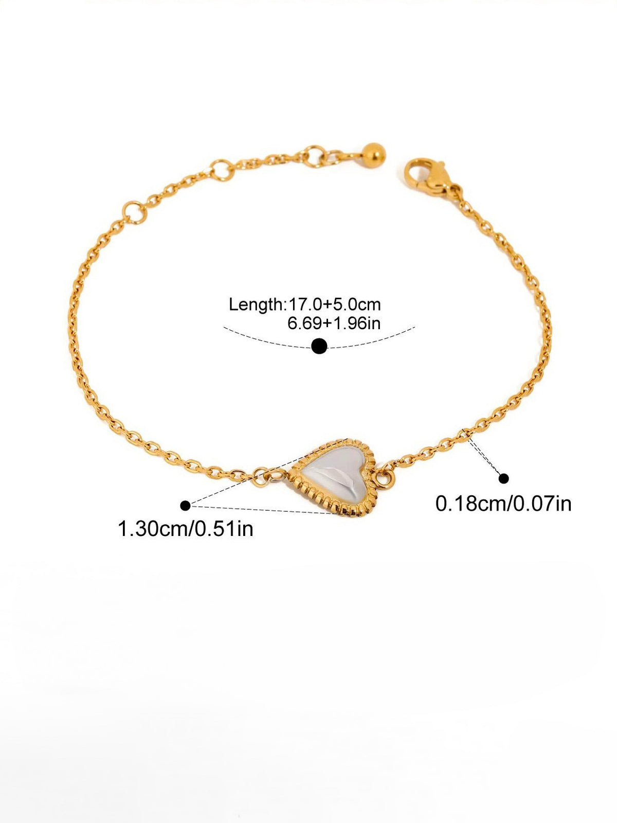 - Chain Style: Delicate link chain with pearlescent heart charm