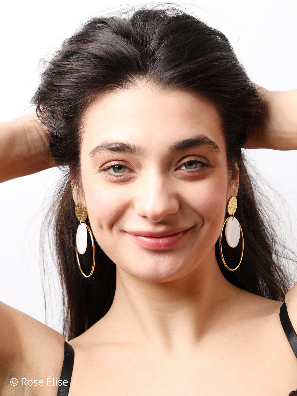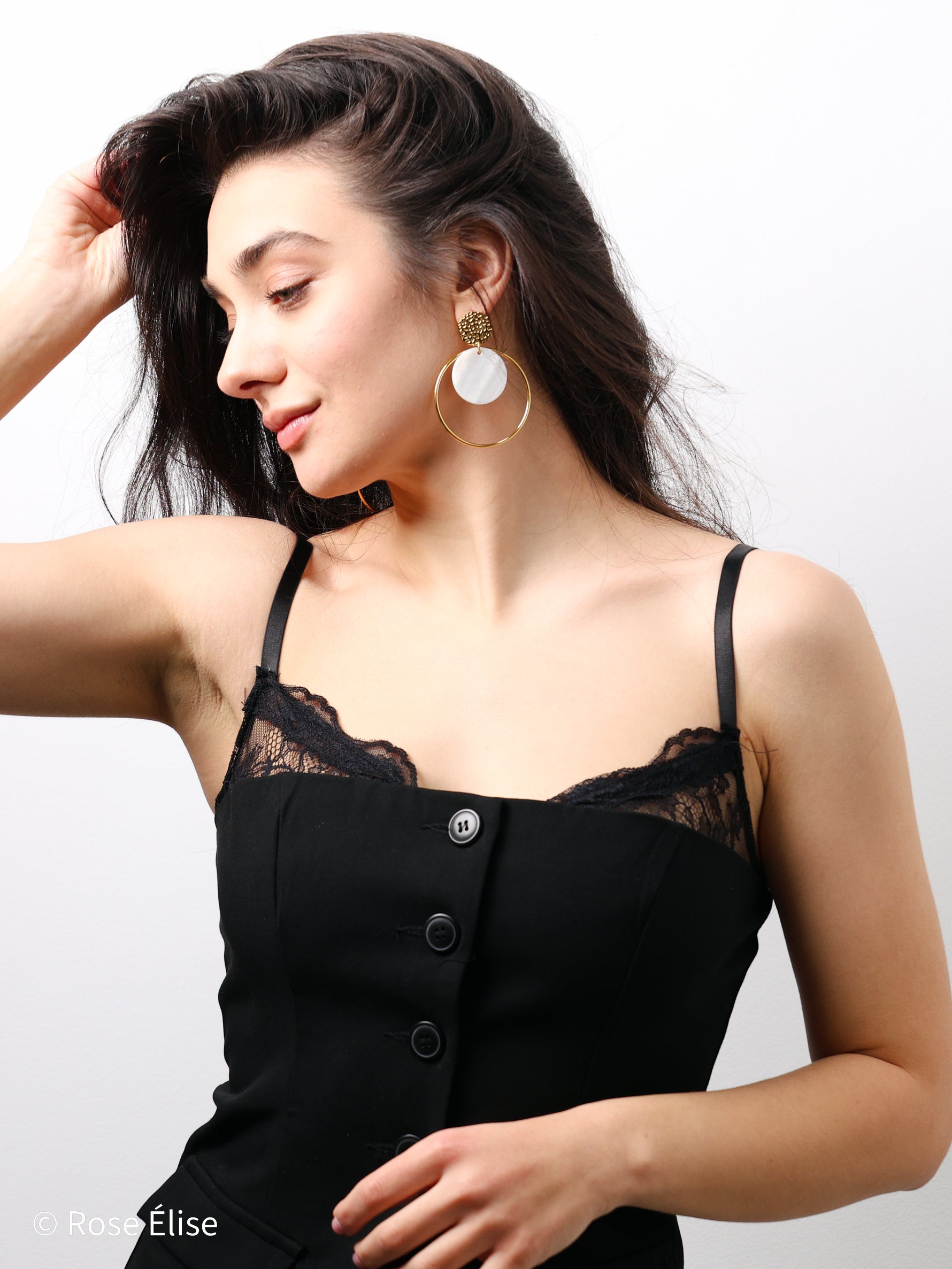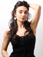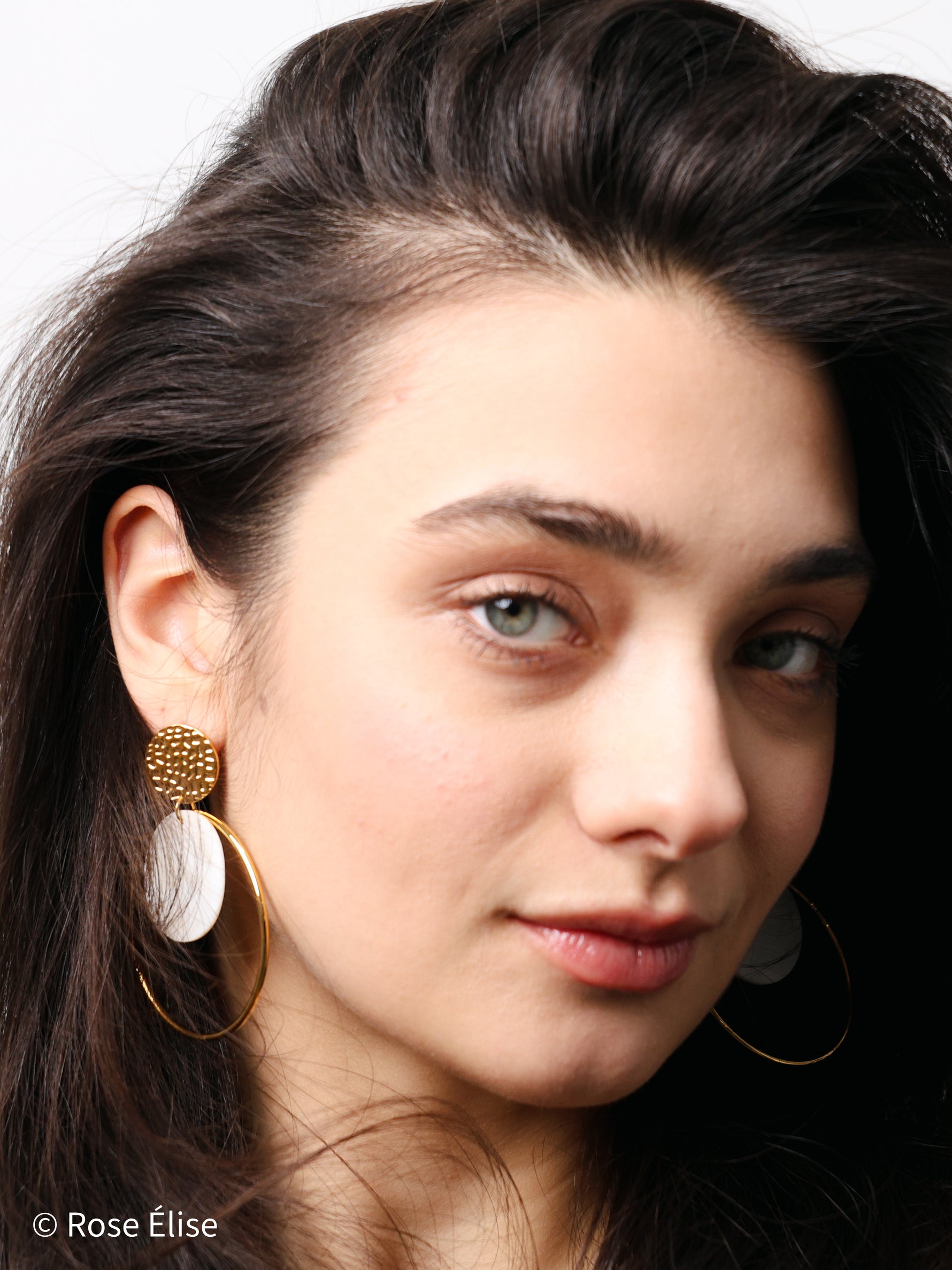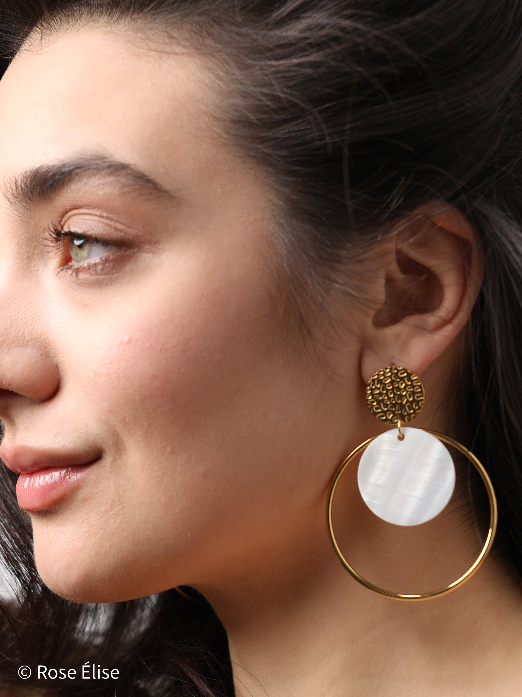 The name Étoile (French for "star") reflects the radiant, celestial quality of the circular design and luminous shell accents. The hammered texture gold disc stud adds artisanal detail, while the oversized polished gold hoop frames a floating natural shell disc with soft iridescent shimmer. The layered circular elements create a sophisticated, architectural look with beautiful movement. Perfect for those who appreciate jewelry that combines luxurious materials with bold, modern design. The waterproof construction ensures lasting beauty and worry-free everyday wear.