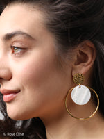 Introducing the Étoile 18k Gold Textured Disc Shell Hoop Earrings, a bold statement piece that brings modern elegance to your everyday style. Featuring textured gold disc studs with oversized gold hoops and luminous shell disc accents, these earrings are truly captivating.