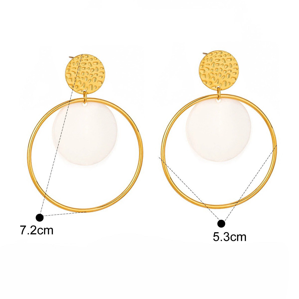 - Special Feature: Hammered texture disc stud with oversized hoop and floating shell disc
