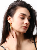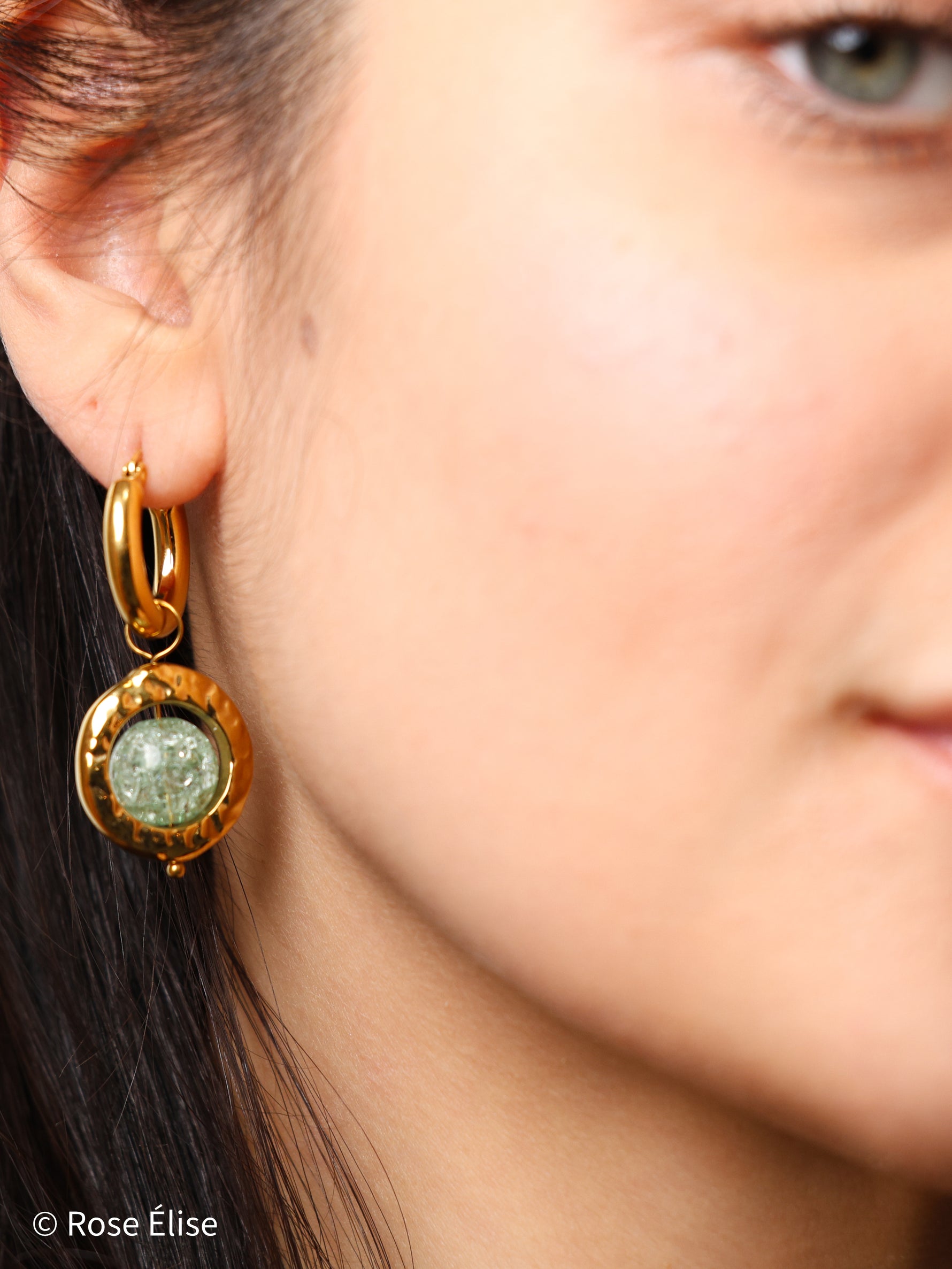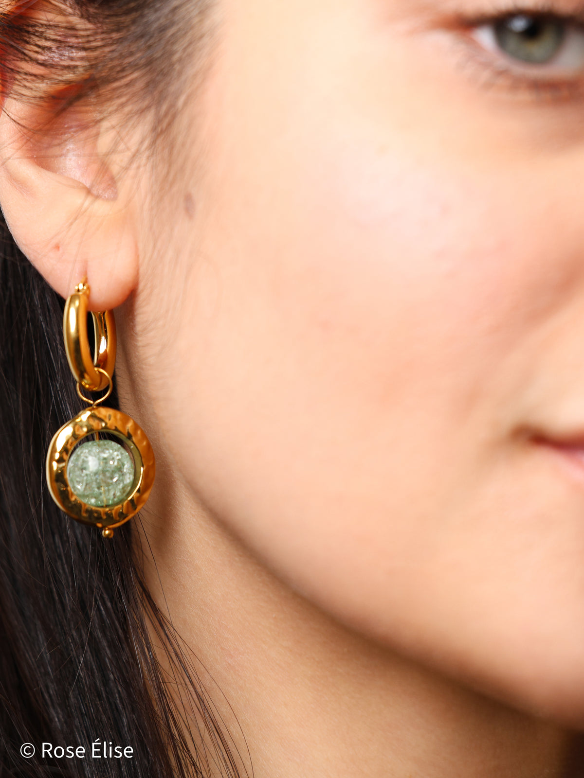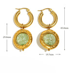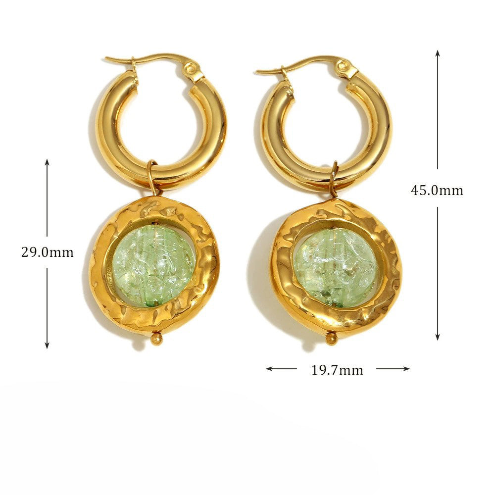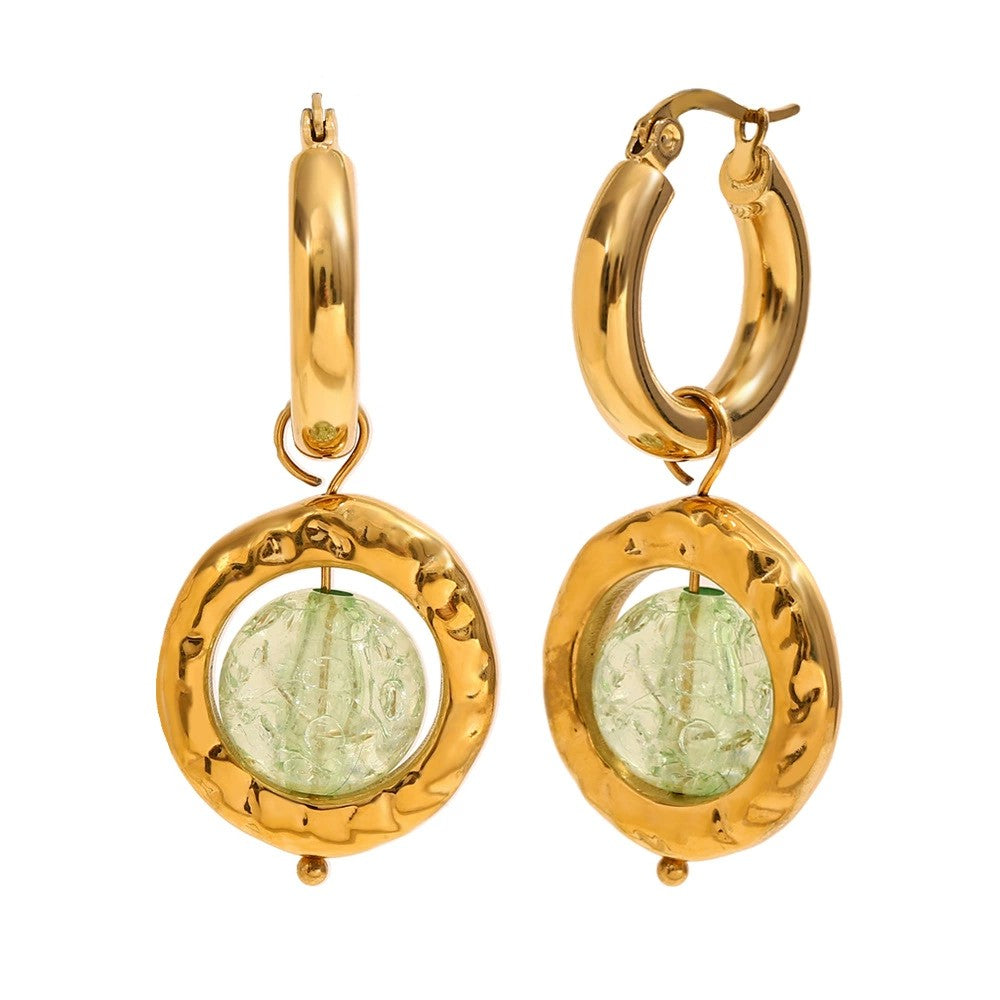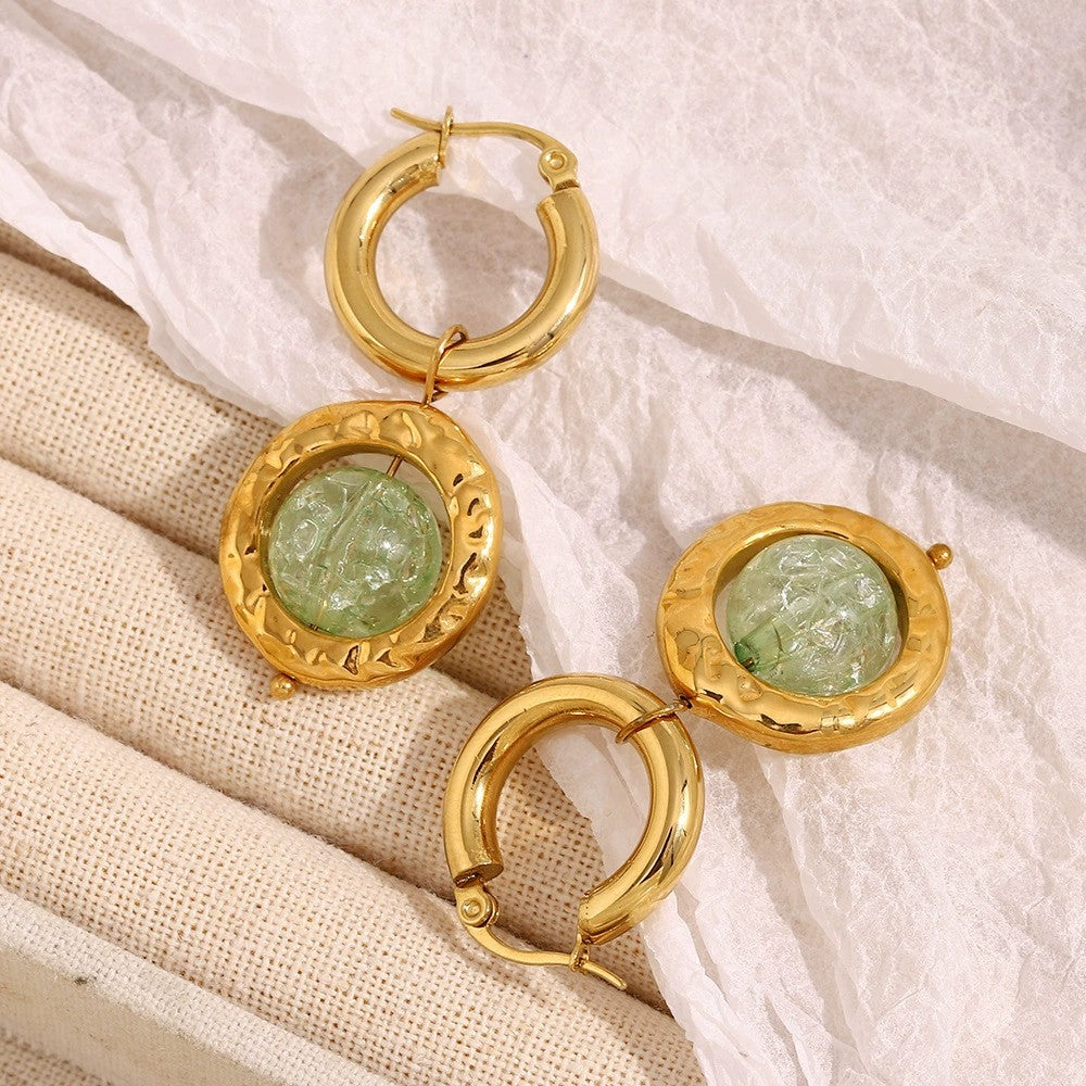 The name Jade reflects the beautiful green crystal centerpiece that resembles precious jade stone. The chunky polished gold hoops connect to hammered texture disc frames that showcase translucent green carved crystals with intricate detailing. The artisanal hammered finish adds texture and dimension, creating a sophisticated, contemporary look. Perfect for those who appreciate jewelry that combines luxurious materials with bold, artistic design. The waterproof construction ensures lasting beauty and worry-free everyday wear.