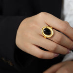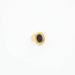 Introducing the Noir 18k Gold Black Onyx Ring, a sophisticated statement piece that brings bold elegance to your everyday style. Featuring an oval black onyx stone set in a double-circle gold frame, this ring is both striking and refined.
