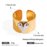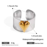 Part of our exclusive Dualité collection, this ring captures striking beauty with its two-tone design. The name Dualité (French for "duality") reflects the harmonious interplay of gold and silver tones in the piece. The wide band features a dimensional heart motif in contrasting metal, creating a bold, sophisticated look. Perfect for those who appreciate jewelry that combines luxurious materials with modern, timeless design. The waterproof construction ensures lasting beauty and worry-free everyday wear.