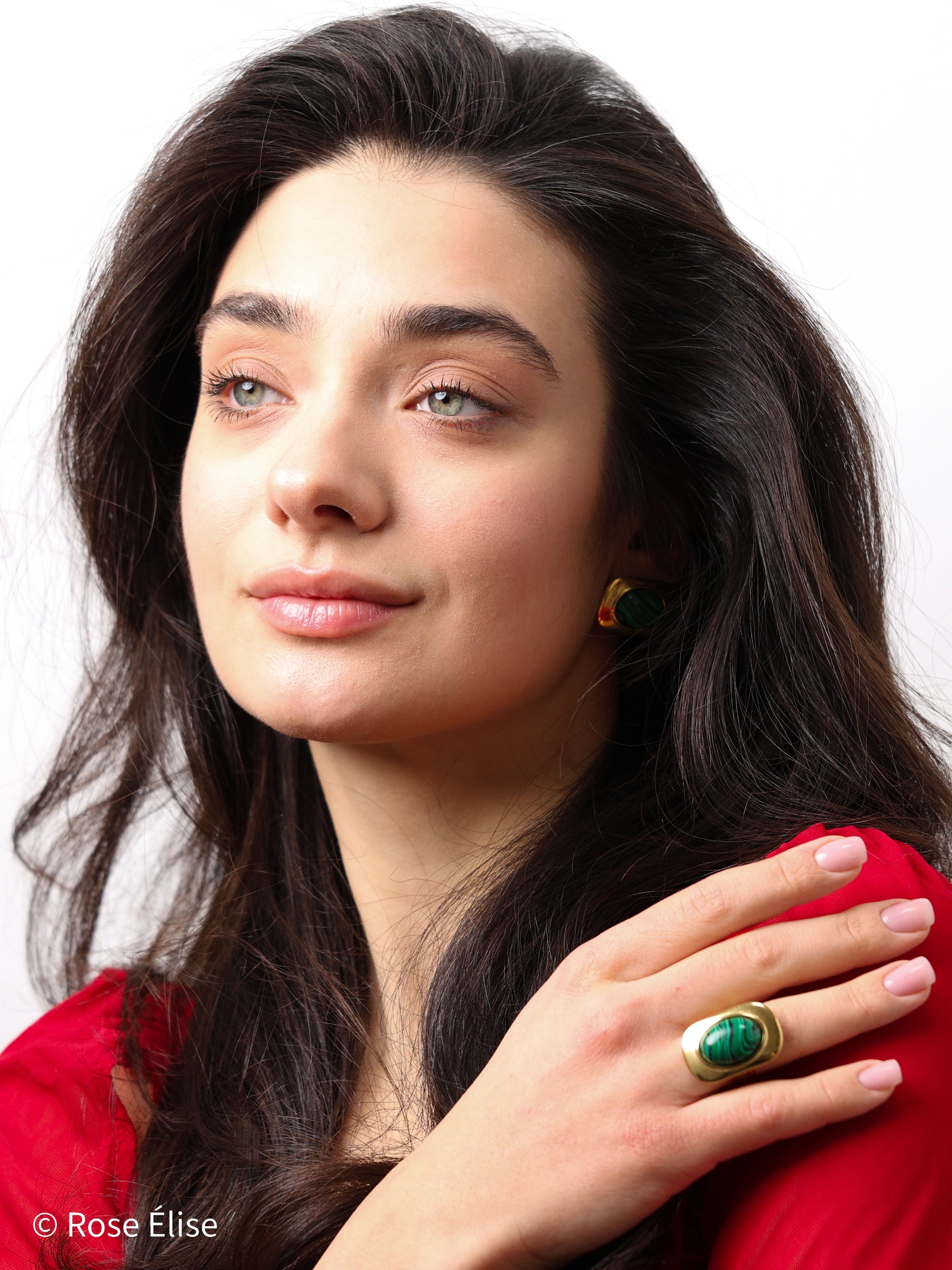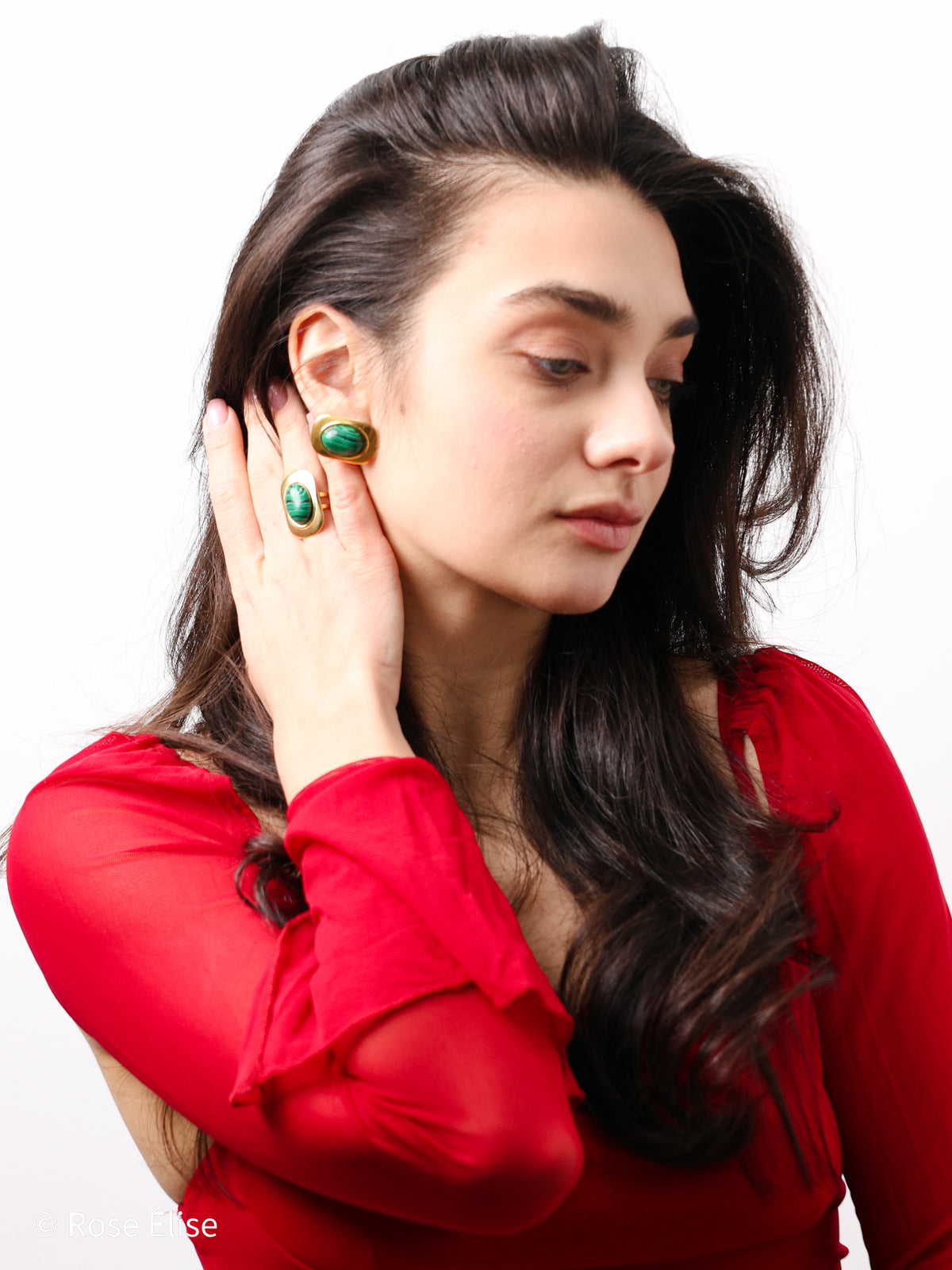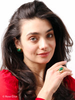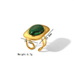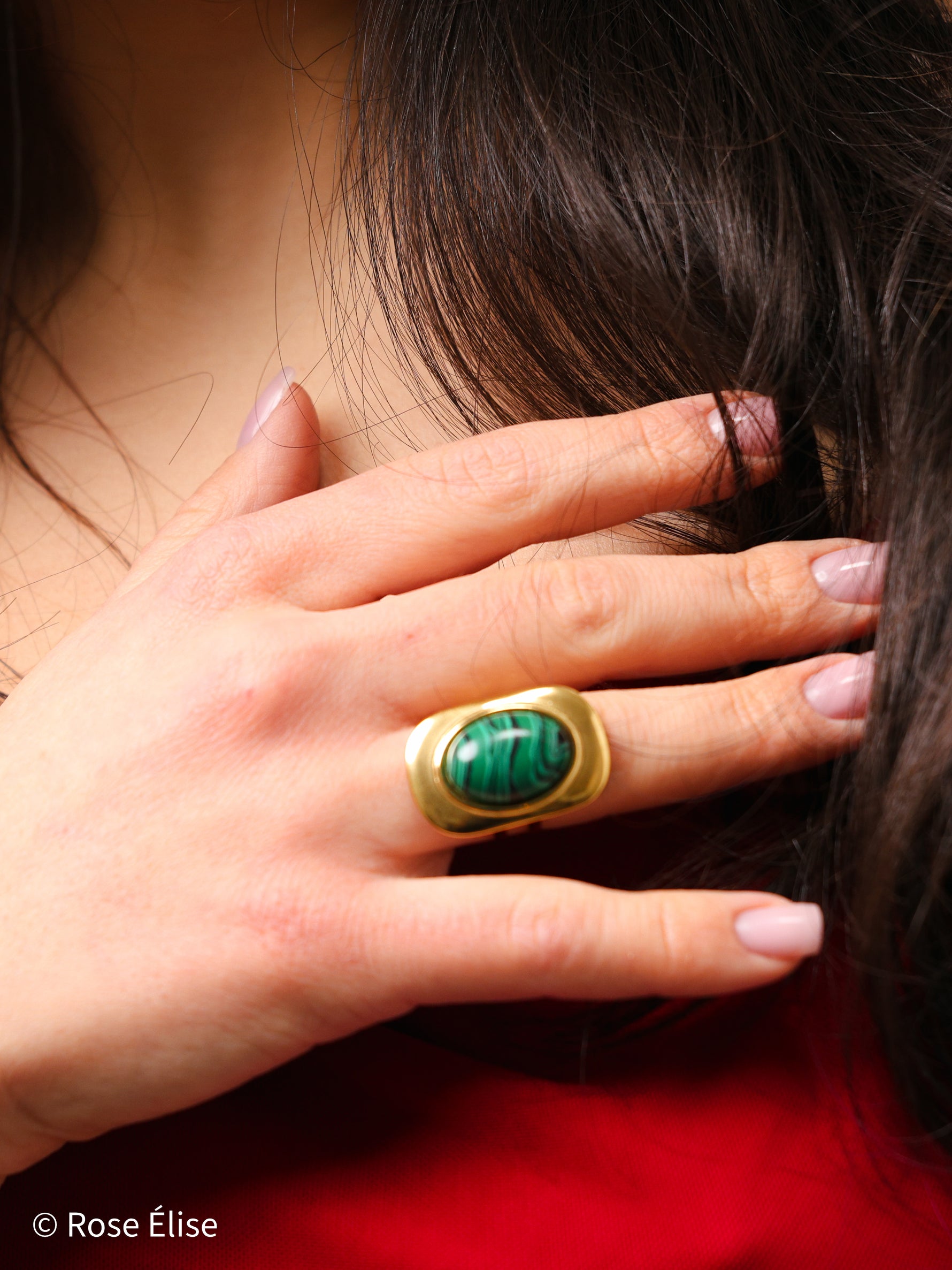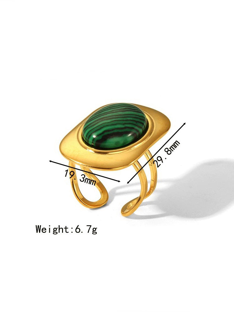 Part of our exclusive Rivière collection, this ring captures nature's artistry with its malachite stone. The name Rivière (French for "river") reflects the flowing, river-like banding patterns in the malachite gemstone. The stone features unique natural patterns in rich green tones, set within a sleek geometric gold frame that enhances the stone's beauty. The adjustable open band with decorative loops ensures a comfortable, customized fit. Perfect for those who appreciate jewelry that combines luxurious materials with natural, bold design. The waterproof construction ensures lasting beauty and worry-free everyday wear.