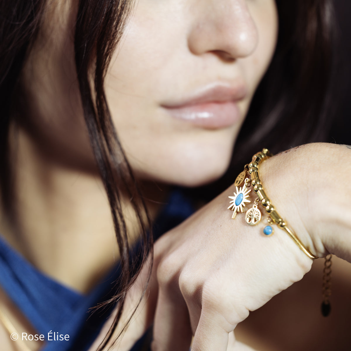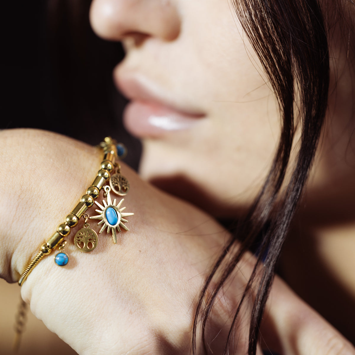 Part of our exclusive Azura collection, this bracelet captures spiritual elegance with its meaningful symbols and vibrant turquoise accents. The sun represents vitality and energy, while the tree of life symbolizes growth and connection. The combination of gold beads and turquoise stones creates a stunning bohemian-luxe aesthetic. The adjustable design ensures a perfect fit, and the waterproof construction means worry-free everyday wear. Pair it with the matching Azura necklace for a complete coordinated look that celebrates spiritual beauty.