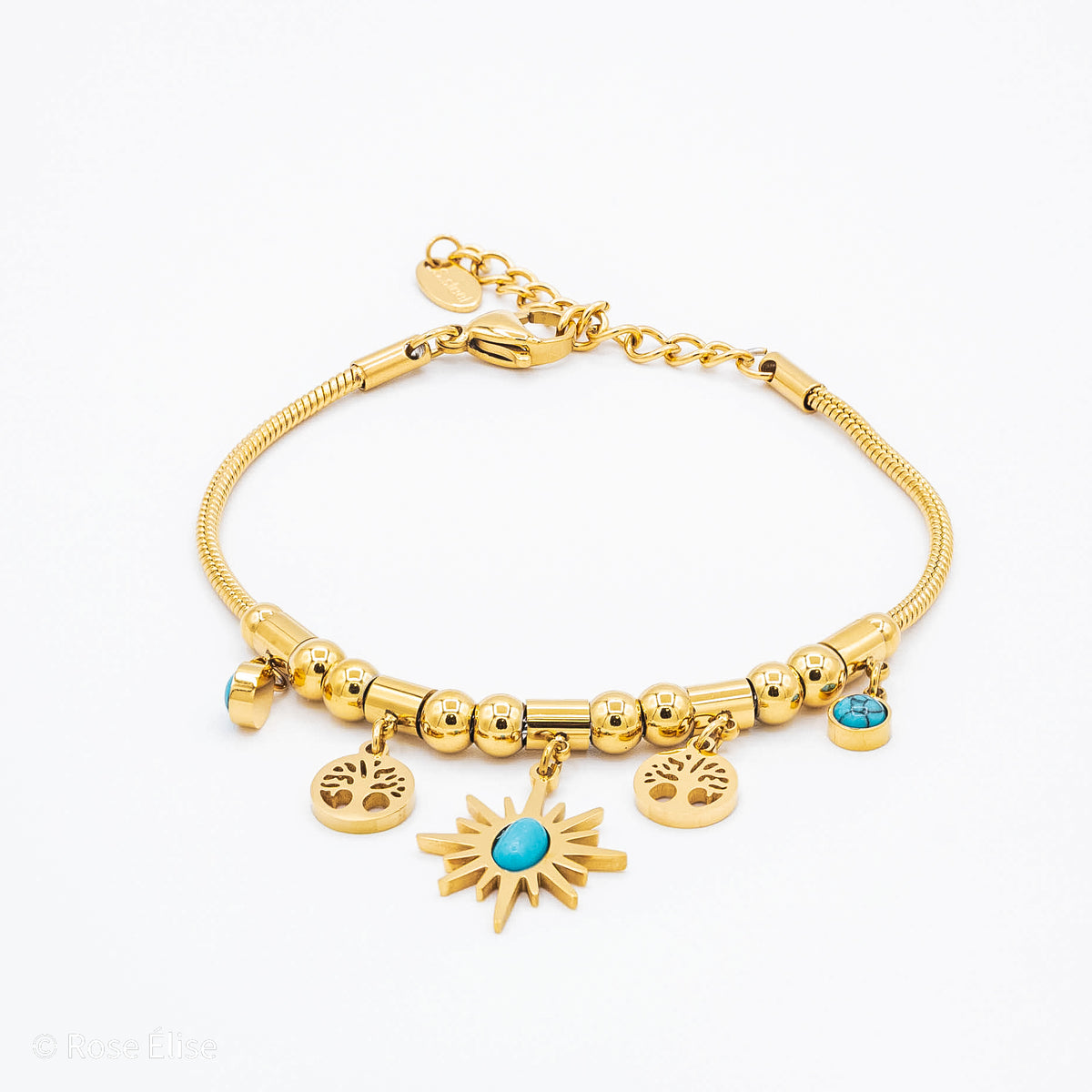 - Charm Features: Central sun charm with turquoise stone, two tree of life charms, turquoise bead accents