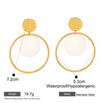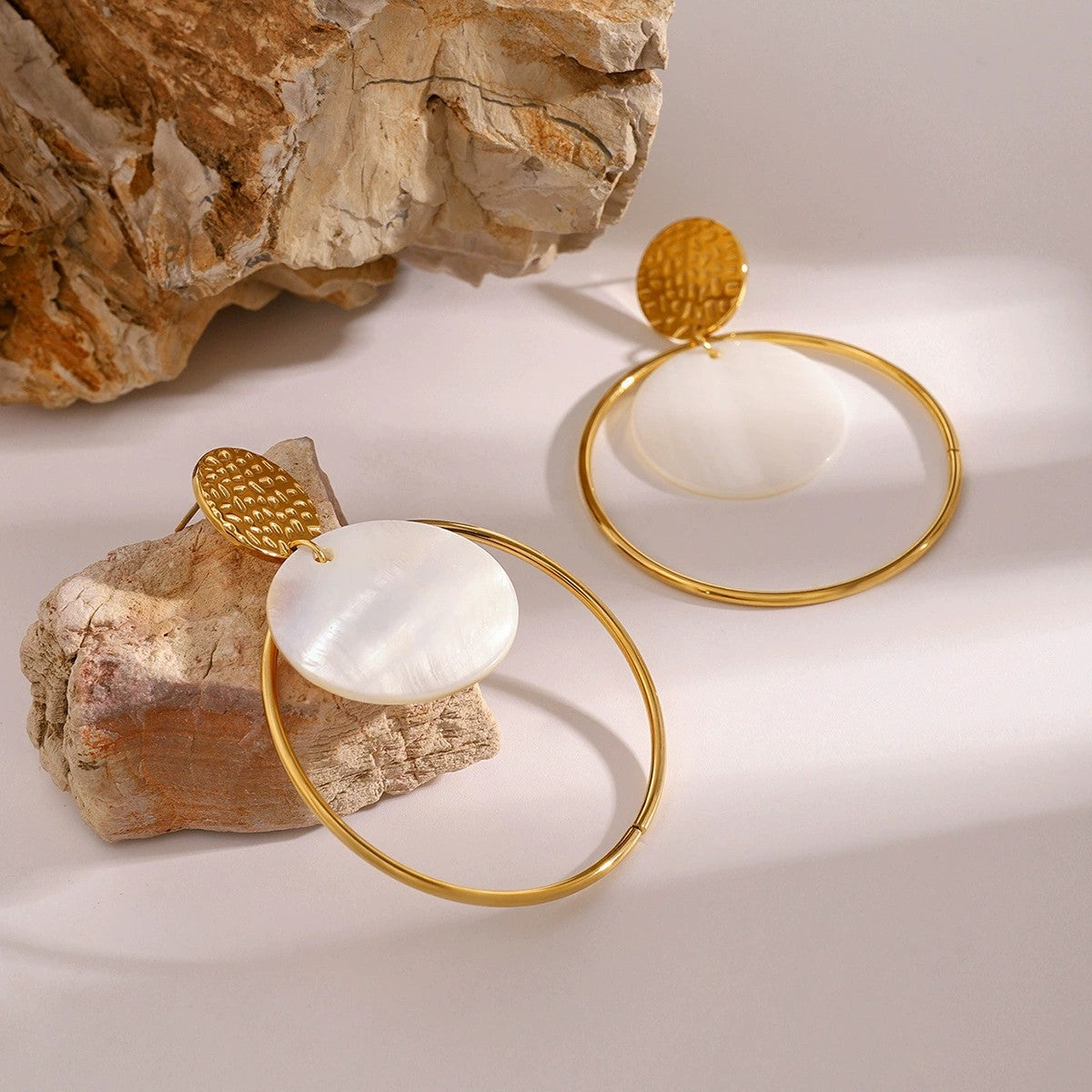 The name Étoile (French for "star") reflects the radiant, celestial quality of the circular design and luminous shell accents. The hammered texture gold disc stud adds artisanal detail, while the oversized polished gold hoop frames a floating natural shell disc with soft iridescent shimmer. The layered circular elements create a sophisticated, architectural look with beautiful movement. Perfect for those who appreciate jewelry that combines luxurious materials with bold, modern design. The waterproof construction ensures lasting beauty and worry-free everyday wear.