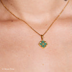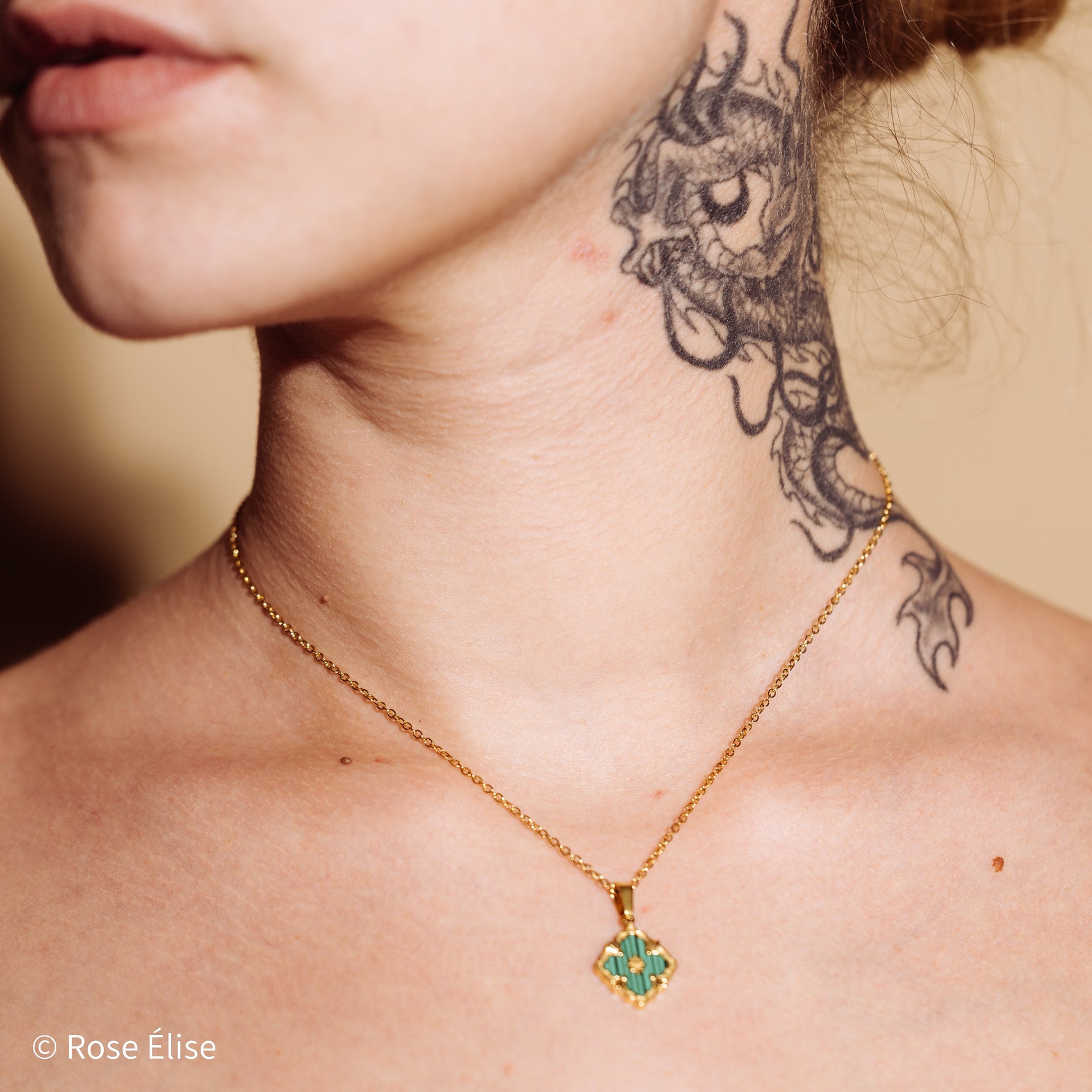 Introducing the Verdant 18k Gold Malachite Clover Necklace, an elegant piece that brings natural sophistication to your everyday style. Featuring a four-leaf clover pendant with vibrant malachite inlay and ornate gold detailing, this necklace is truly captivating.